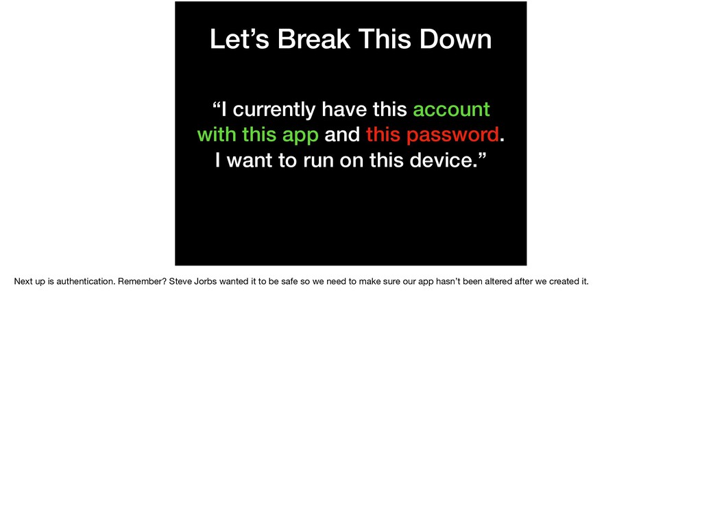 this app and this password. I want to run on this device.” Next up is authentication. Remember? Steve Jorbs wanted it to be safe so we need to make sure our app hasn’t been altered after we created it.