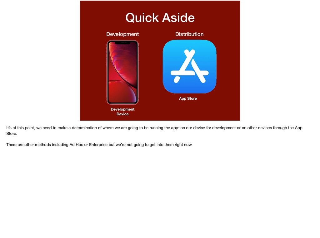 this point, we need to make a determination of where we are going to be running the app: on our device for development or on other devices through the App Store. There are other methods including Ad Hoc or Enterprise but we’re not going to get into them right now.