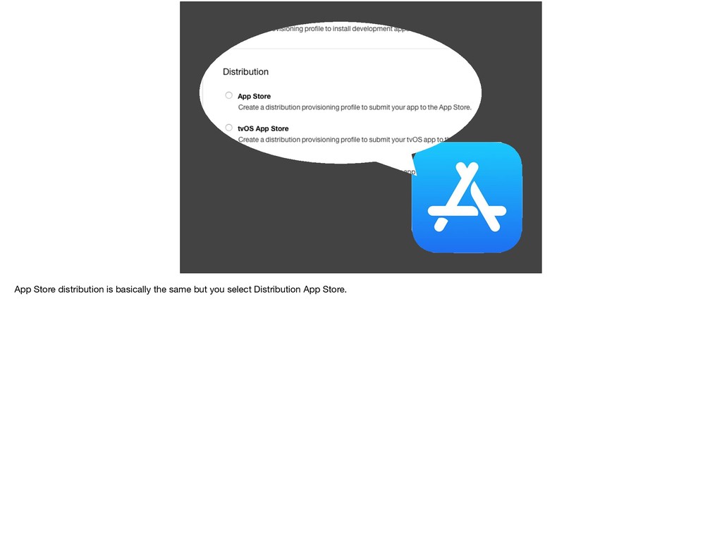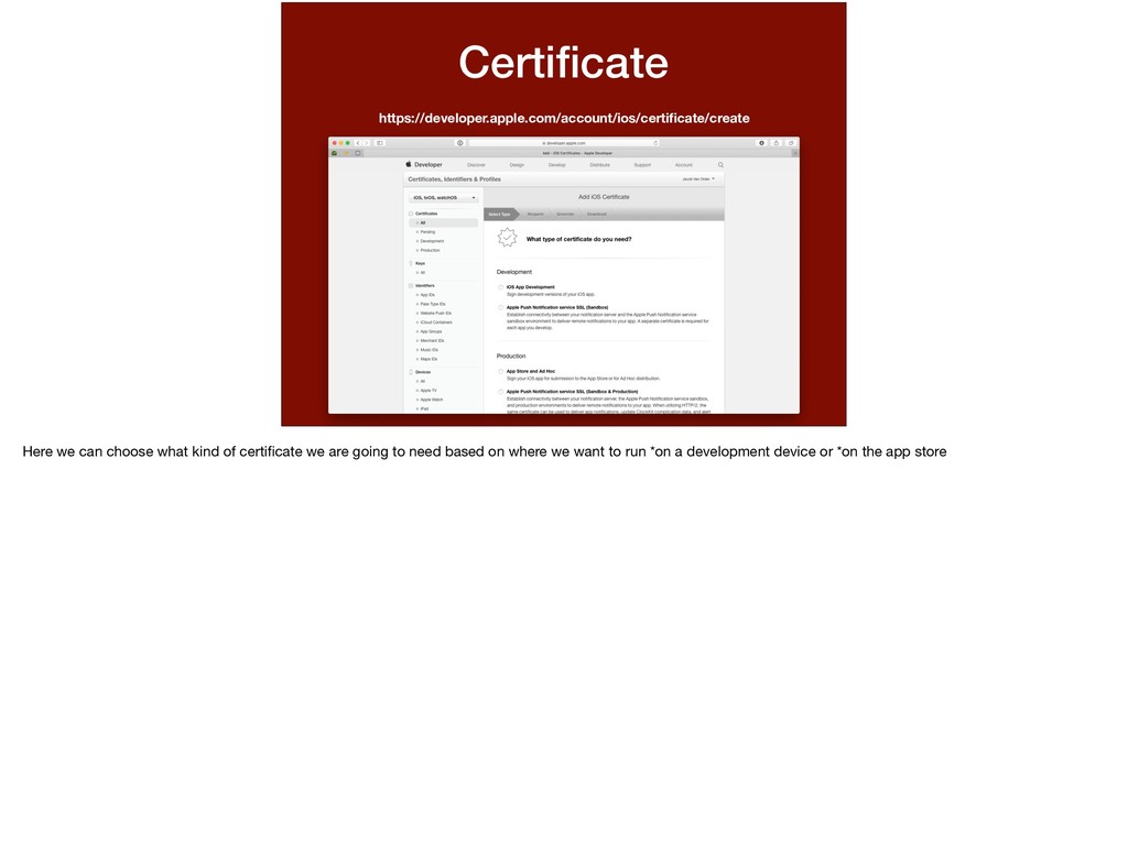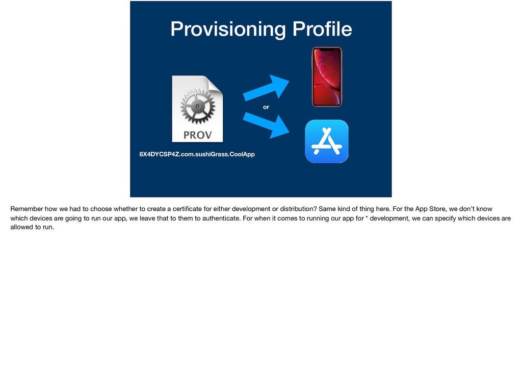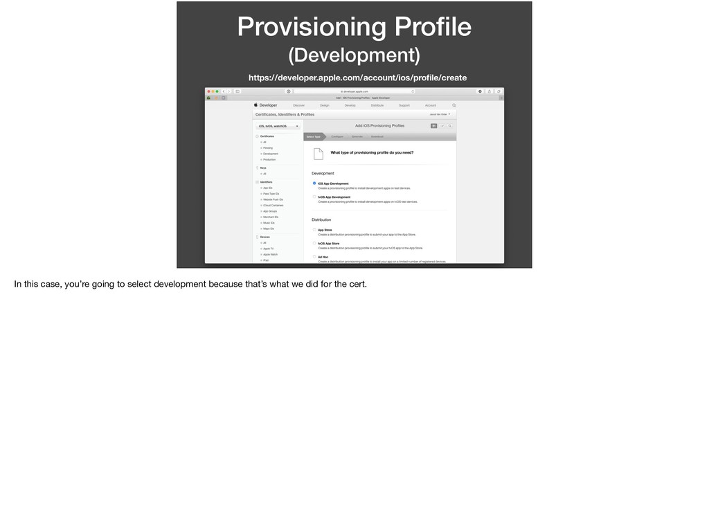 whether to create a certificate for either development or distribution? Same kind of thing here. For the App Store, we don’t know which devices are going to run our app, we leave that to them to authenticate. For when it comes to running our app for * development, we can specify which devices are allowed to run.