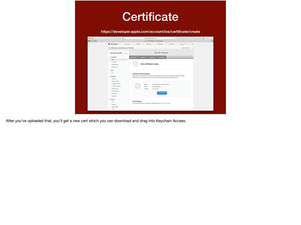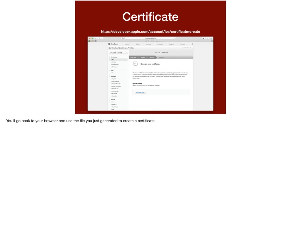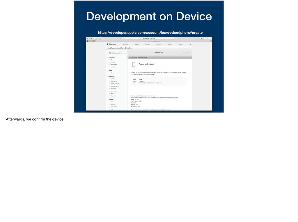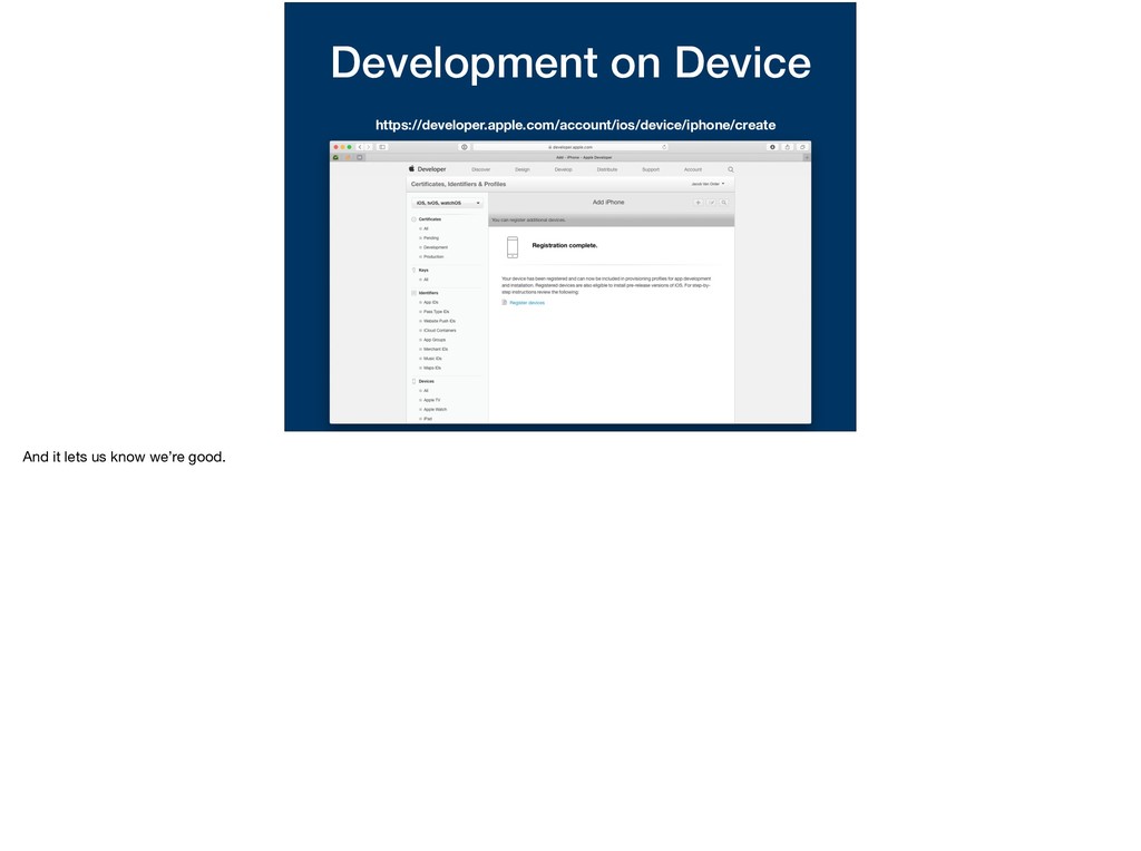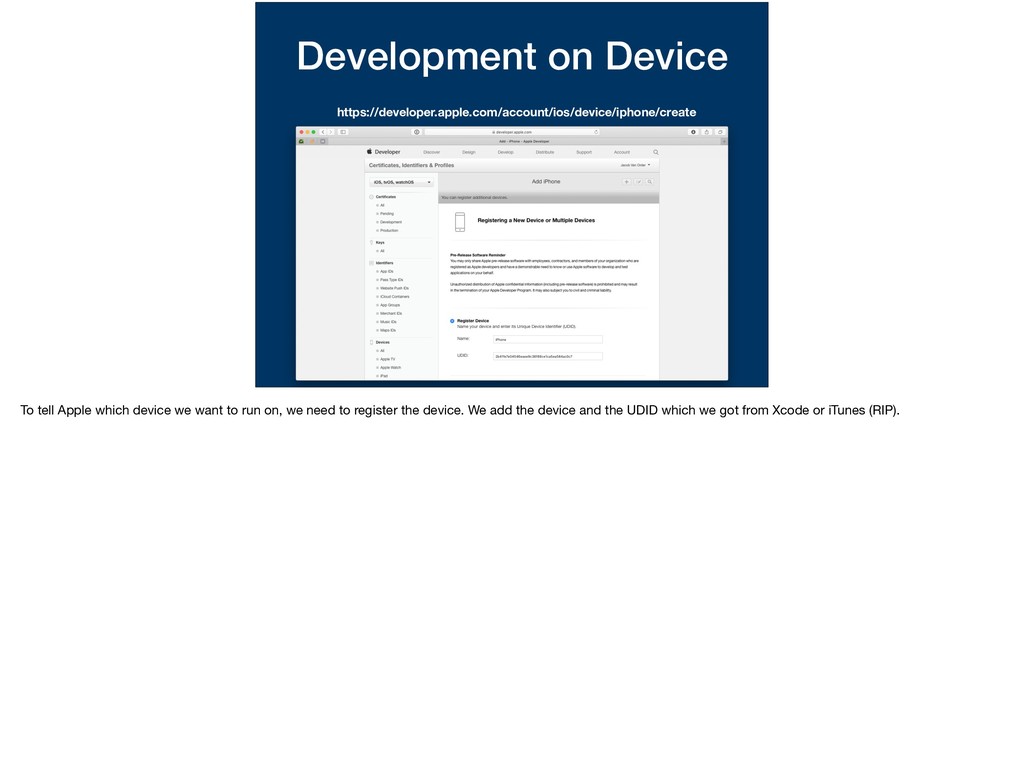whether to create a certificate for either development or distribution? Same kind of thing here. For the App Store, we don’t know which devices are going to run our app, we leave that to them to authenticate. For when it comes to running our app for * development, we can specify which devices are allowed to run.