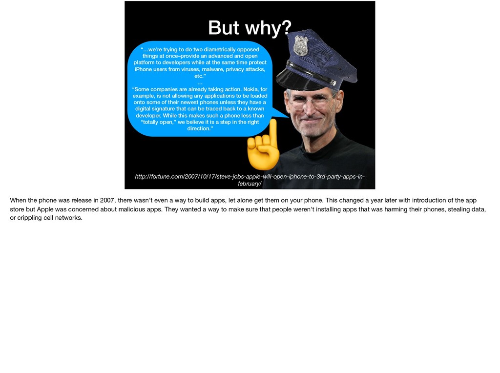 opposed things at once–provide an advanced and open platform to developers while at the same time protect iPhone users from viruses, malware, privacy attacks, etc.” … “Some companies are already taking action. Nokia, for example, is not allowing any applications to be loaded onto some of their newest phones unless they have a digital signature that can be traced back to a known developer. While this makes such a phone less than “totally open,” we believe it is a step in the right direction.” ☝ When the phone was release in 2007, there wasn't even a way to build apps, let alone get them on your phone. This changed a year later with introduction of the app store but Apple was concerned about malicious apps. They wanted a way to make sure that people weren't installing apps that was harming their phones, stealing data, or crippling cell networks.