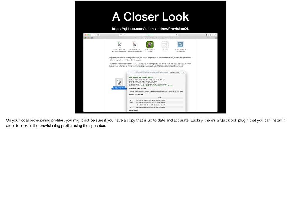 might not be sure if you have a copy that is up to date and accurate. Luckily, there’s a Quicklook plugin that you can install in order to look at the provisioning profile using the spacebar.