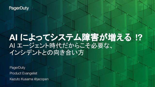 ライフサイクル全体を通して、インシデントの状況をリアルタイムで可視化 インシデントを特定 ⾃動処理 運⽤改善のための 知⾒を提供 最適な担当者に通知 迅速な解決を⽀援 あらゆるツールから イベントを受信 架電、 SMS、メール Appプッシュ通知、チャット ⾃動エスカレーション スケジュール管理 診断‧修復作業の⾃動化 チーム内外と円滑に連携 クラウド コンテナ マイクロサービス ネットワーク アプリ‧サービス セキュリティ データベース サーバー ソーシャル PagerDuty Operations Cloud インシデントをより早く‧少ないリソースで解決 / 将来のインシデントを未然に防ぐ 担当者が最適な 通知⽅法を選択 対応履歴 MTTA/MTTR 分析 担当者の負荷状況 ポストモーテム 解決のヒントを提⽰ • 過去の類似インシデント • 直近の構成/コード変更 ...etc. 80%-99% ノイズ削減 700+ Integrations
