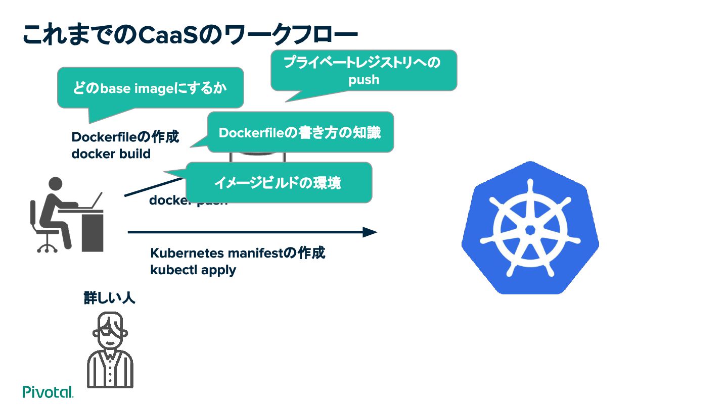 $ pack build jacopen/testapp 2018/11/19 17:14:31 Pulling builder image 'packs/samples' (use --no-pull flag to skip this step) 2018/11/19 17:14:33 Selected run image 'packs/run' from stack 'io.buildpacks.stacks.bionic' 2018/11/19 17:14:33 Pulling run image 'packs/run' (use --no-pull flag to skip this step) *** DETECTING: 2018/11/19 08:14:43 Group: Sample Node.js Buildpack: pass *** ANALYZING: Reading information from previous image for possible re-use 2018/11/19 17:14:44 WARNING: skipping analyze, image not found 中略 ---> 170c76d2c366 Successfully built 170c76d2c366 Successfully tagged jacopen/testapp:latest Dockerfileすら無いnode.jsアプリのディレクトリで pack buildコマンドを一発打つだけで、 自動的にイメージのビルドやってくれて超らくちん というデモをしました