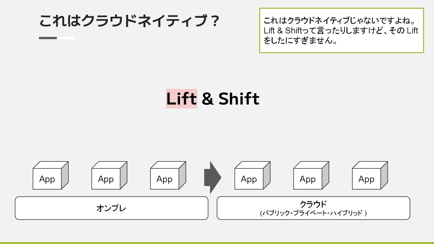 App Lift & Shift これはクラウドネイティブじゃないですよね。 Lift & Shiftって言ったりしますけど、その Lift をしたにすぎません。