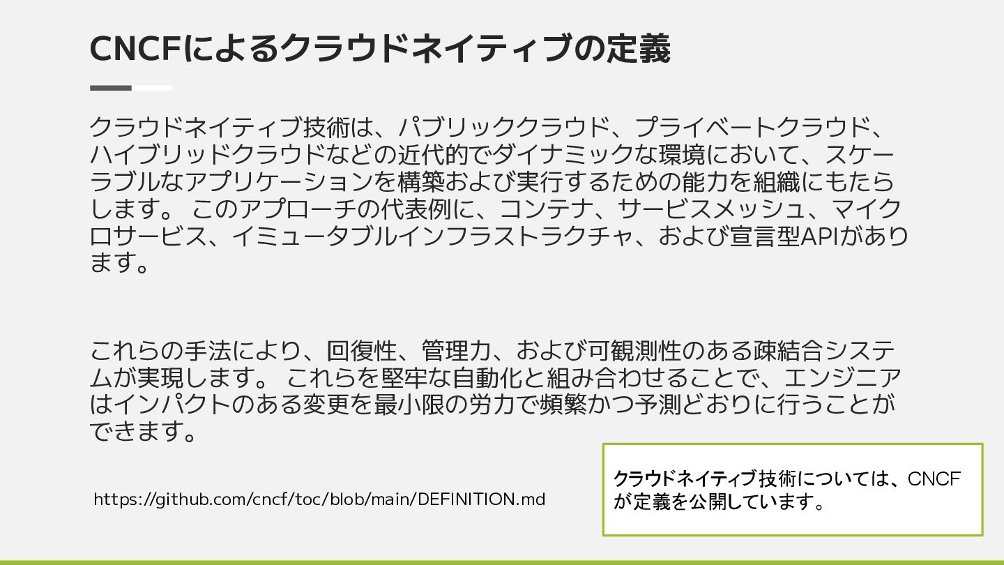 つまり、クラウドネイティブの本質とは 全ての活動において 『コンピュータの力でコンピュータを動かす』 『人間の関与を無くす』 を実践していくこと。 https://github.com/cncf/toc/blob/main/DEFINITION.md