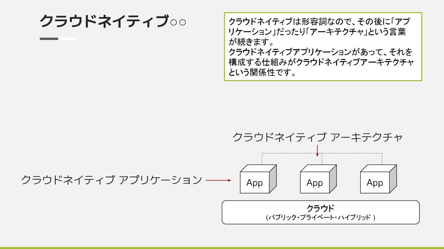 クラウドネイティブ◦◦ クラウドネイティブは形容詞なので、その後に「アプ リケーション」だったり「アーキテクチャ」という言葉 が続きます。 クラウドネイティブアプリケーションがあって、それを 構成する仕組みがクラウドネイティブアーキテクチャ という関係性です。