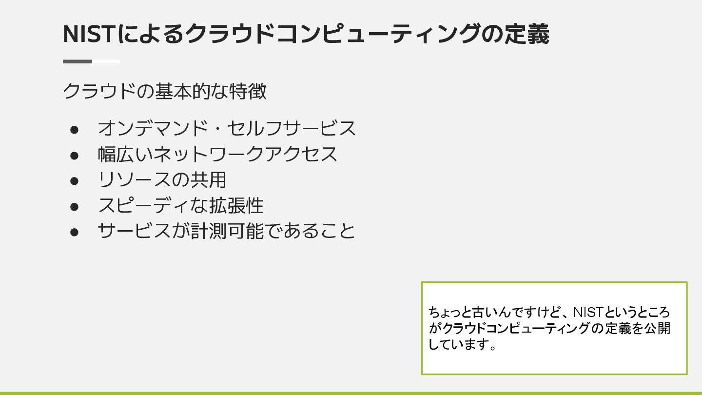 • サービスが計測可能であること https://www.ipa.go.jp/files/000025366.pdf ちょっと古いんですけど、 NISTというところ がクラウドコンピューティングの定義を公開 しています。