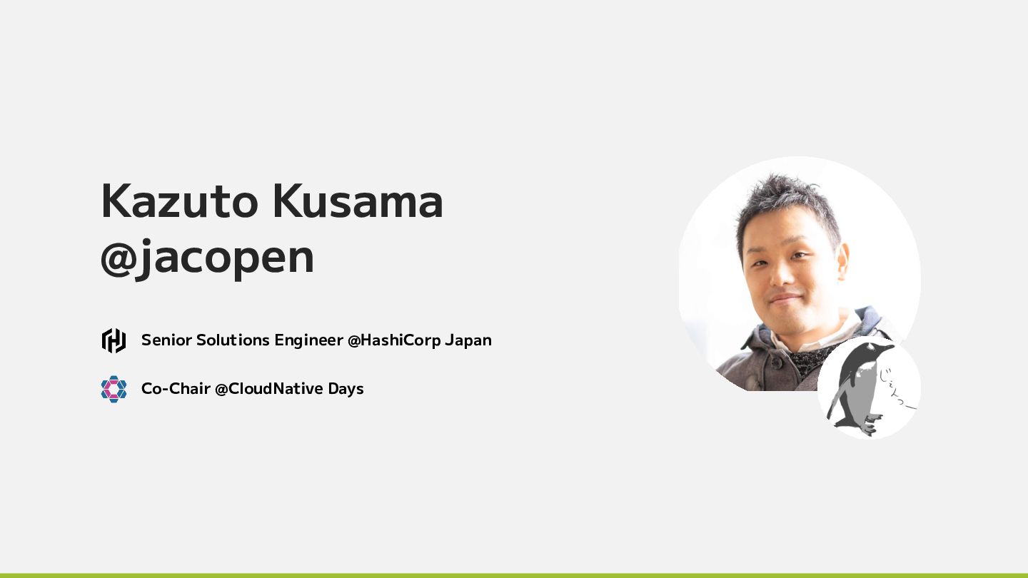 Kazuto Kusama @jacopen Senior Solutions Engineer @HashiCorp Japan Co-Chair @CloudNative