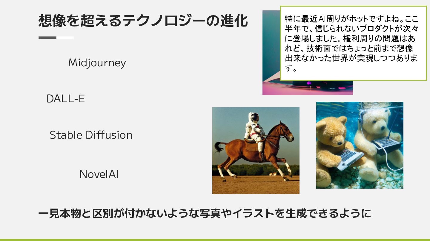 想像を超えるテクノロジーの進化 Midjourney DALL-E Stable Diffusion NovelAI 一見本物と区別が付かないような写真やイラストを生成できるように 特に最近AI周りがホットですよね。ここ 半年で、信じられないプロダクトが次々 に登場しました。権利周りの問題はあ
