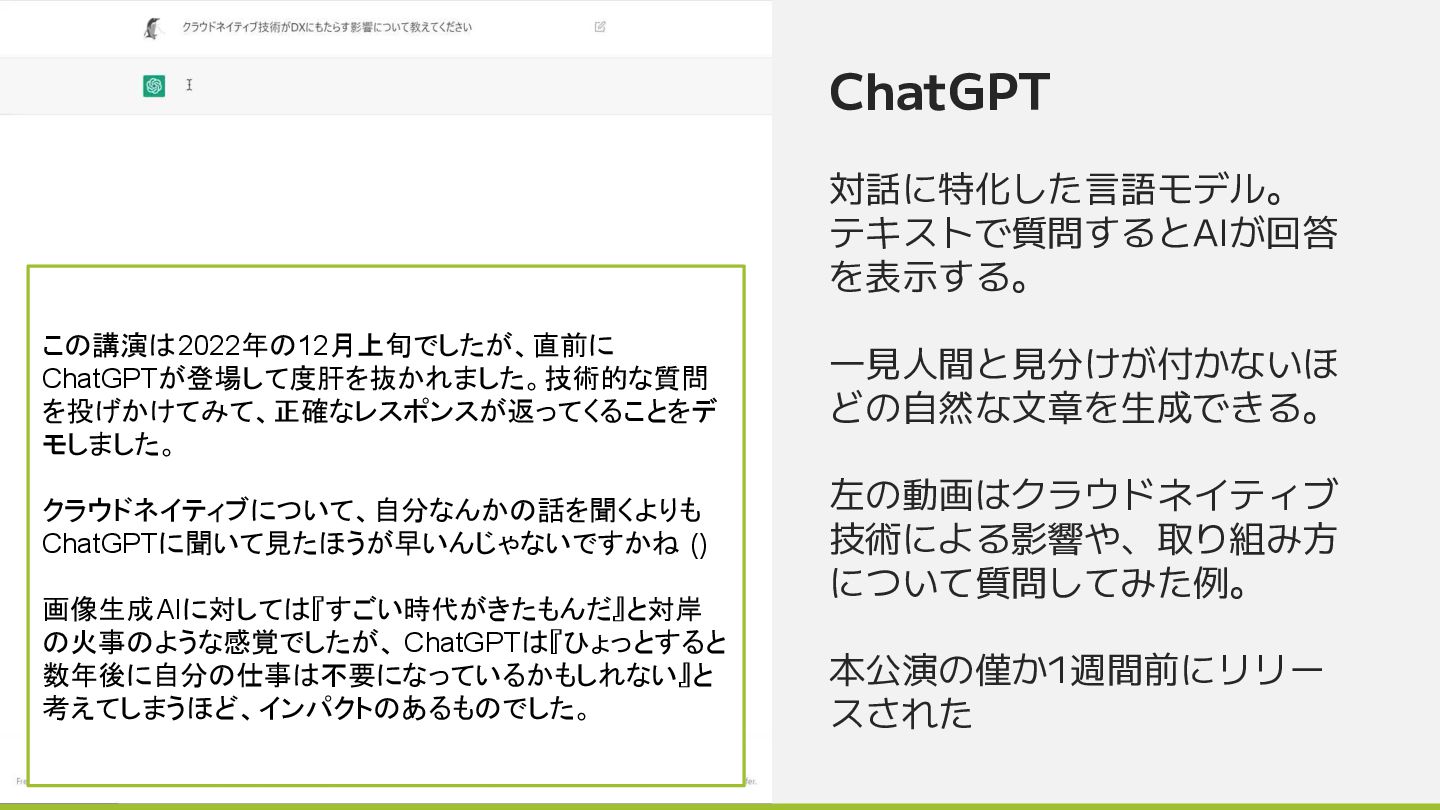 スされた この講演は2022年の12月上旬でしたが、直前に ChatGPTが登場して度肝を抜かれました。技術的な質問 を投げかけてみて、正確なレスポンスが返ってくることをデ モしました。 クラウドネイティブについて、自分なんかの話を聞くよりも ChatGPTに聞いて見たほうが早いんじゃないですかね () 画像生成AIに対しては『すごい時代がきたもんだ』と対岸 の火事のような感覚でしたが、 ChatGPTは『ひょっとすると 数年後に自分の仕事は不要になっているかもしれない』と 考えてしまうほど、インパクトのあるものでした。
