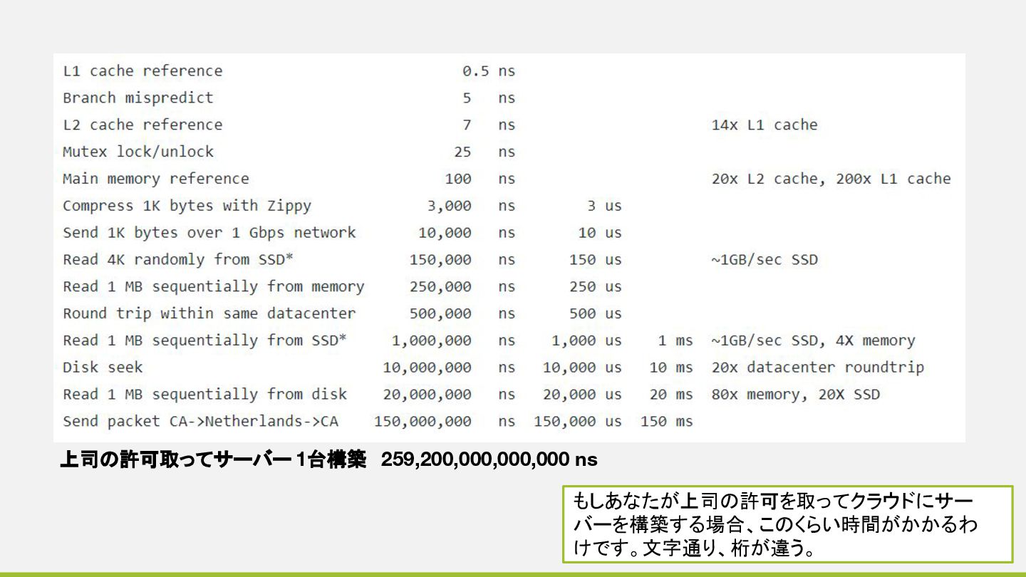 Latency Numbers Every Programmer Should Know https://gist.github.com/jboner/2841832 上司の許可取ってサーバー 1台構築 259,200,000,000,000 ns