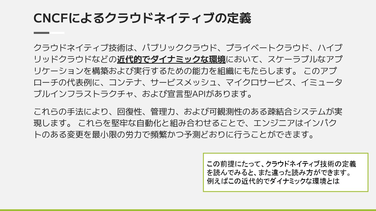 トのある変更を最小限の労力で頻繁かつ予測どおりに行うことができます。 https://github.com/cncf/toc/blob/main/DEFINITION.md この前提にたって、クラウドネイティブ技術の定義 を読んでみると、また違った読み方ができます。 例えばこの近代的でダイナミックな環境とは