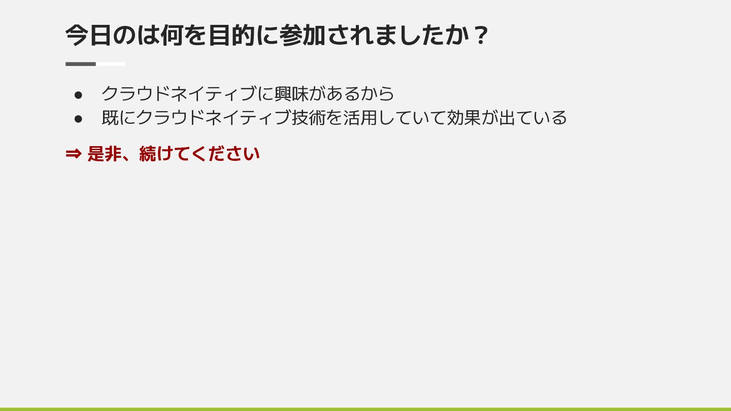 今日のは何を目的に参加されましたか? • クラウドネイティブに興味があるから • 既にクラウドネイティブ技術を活用していて効果が出ている ⇒ 是非、続けてください