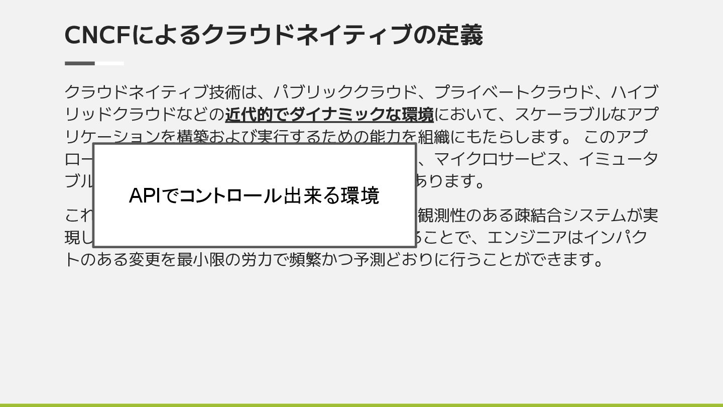 トのある変更を最小限の労力で頻繁かつ予測どおりに行うことができます。 https://github.com/cncf/toc/blob/main/DEFINITION.md APIでコントロール出来る環境