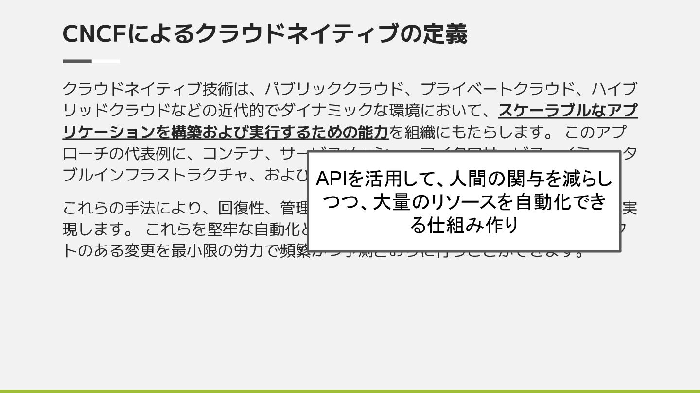 トのある変更を最小限の労力で頻繁かつ予測どおりに行うことができます。 https://github.com/cncf/toc/blob/main/DFINITION.md APIを活用して、人間の関与を減らし つつ、大量のリソースを自動化でき る仕組み作り