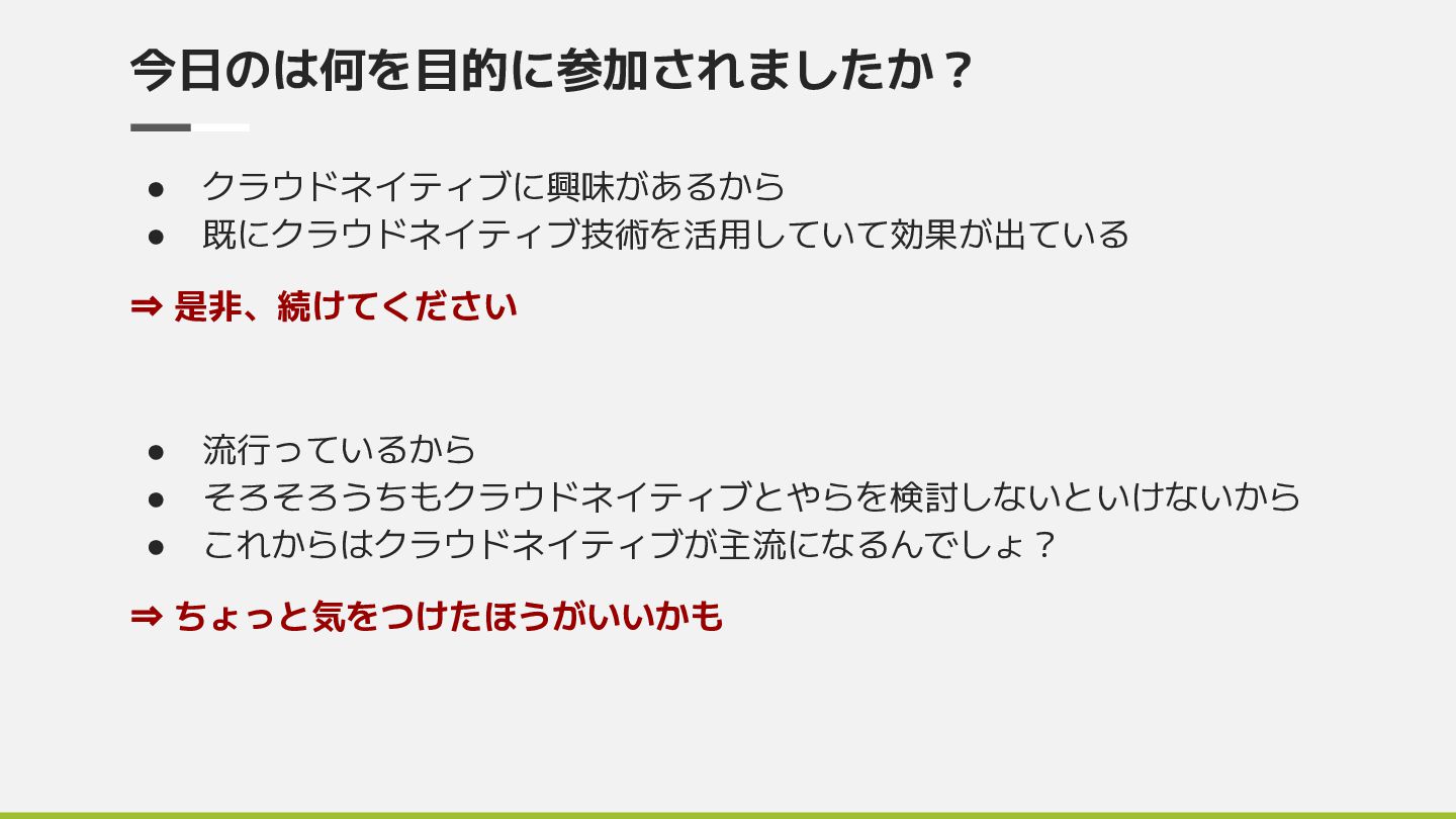 もし、あなたのモチベーションが・・・ 『クラウドネイティブによりシステムを良くしていきたい』 であれば • このあとの説明を聞いて下さい https://www.ipa.go.jp/files/000025366.pdf