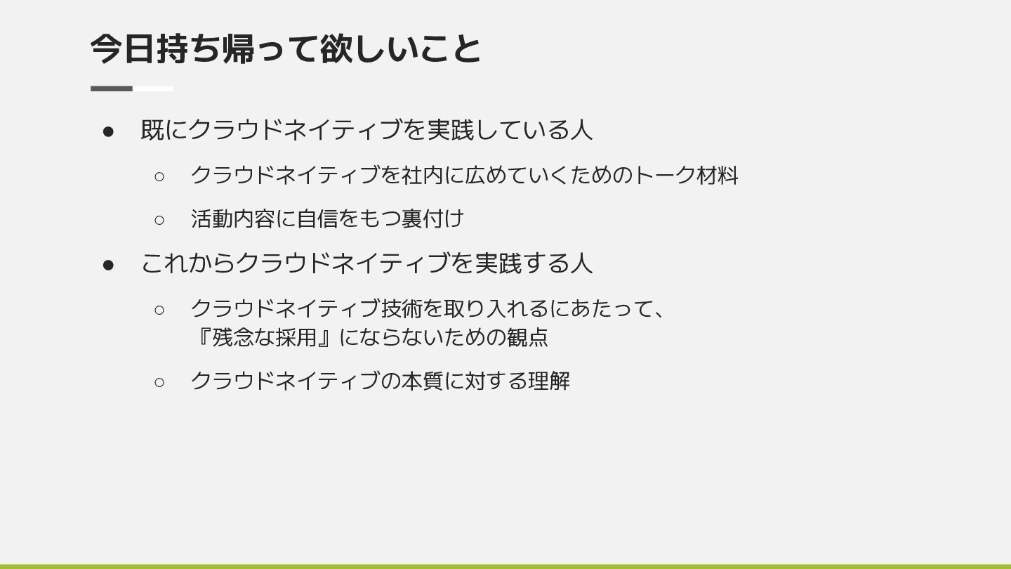 今日持ち帰って欲しいこと • 既にクラウドネイティブを実践している人 ◦ クラウドネイティブを社内に広めていくためのトーク材料 ◦ 活動内容に自信をもつ裏付け • これからクラウドネイティブを実践する人 ◦