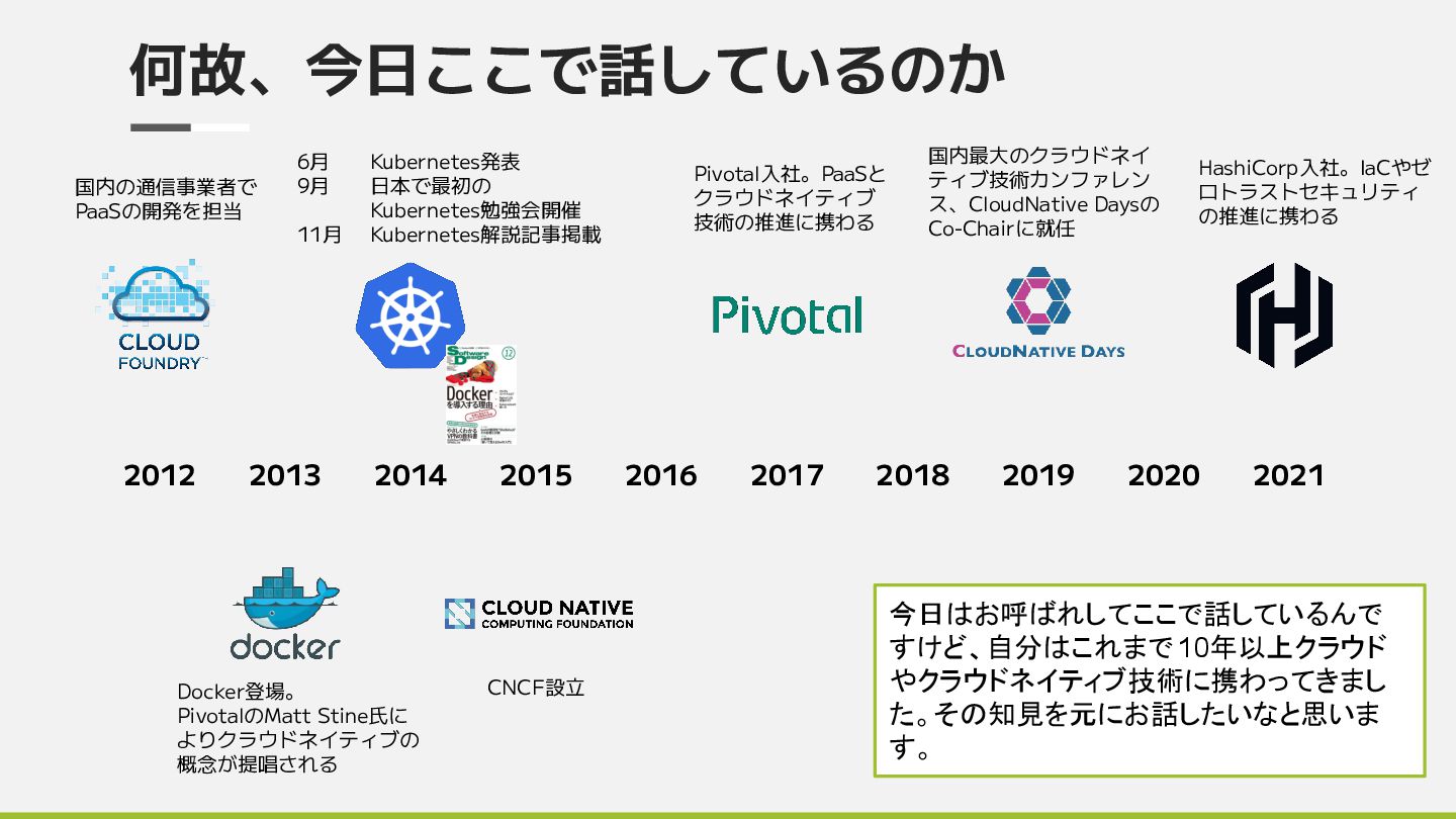 2020 国内の通信事業者で PaaSの開発を担当 6月 Kubernetes発表 9月 日本で最初の Kubernetes勉強会開催 11月 Kubernetes解説記事掲載 Docker登場。 PivotalのMatt Stine氏に よりクラウドネイティブの 概念が提唱される CNCF設立 国内最大のクラウドネイ ティブ技術カンファレン ス、CloudNative Daysの Co-Chairに就任 Pivotal入社。PaaSと クラウドネイティブ 技術の推進に携わる HashiCorp入社。IaCやゼ ロトラストセキュリティ の推進に携わる 今日はお呼ばれしてここで話しているんで すけど、自分はこれまで 10年以上クラウド やクラウドネイティブ技術に携わってきまし た。その知見を元にお話したいなと思いま す。