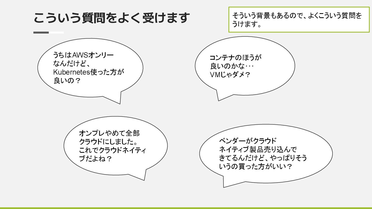 これでクラウドネイティ ブだよね? ベンダーがクラウド ネイティブ製品売り込んで きてるんだけど、やっぱりそう いうの買った方がいい? そう考えると、よく言われるこれらの質問は