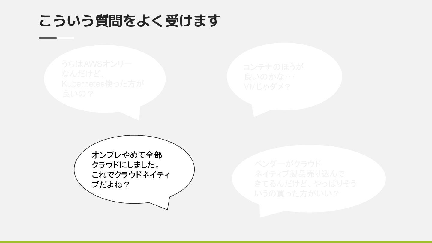 これでクラウドネイティ ブだよね? ベンダーがクラウド ネイティブ製品売り込んで きてるんだけど、やっぱりそう いうの買った方がいい? そういう背景もあるので、よくこういう質問を うけます。