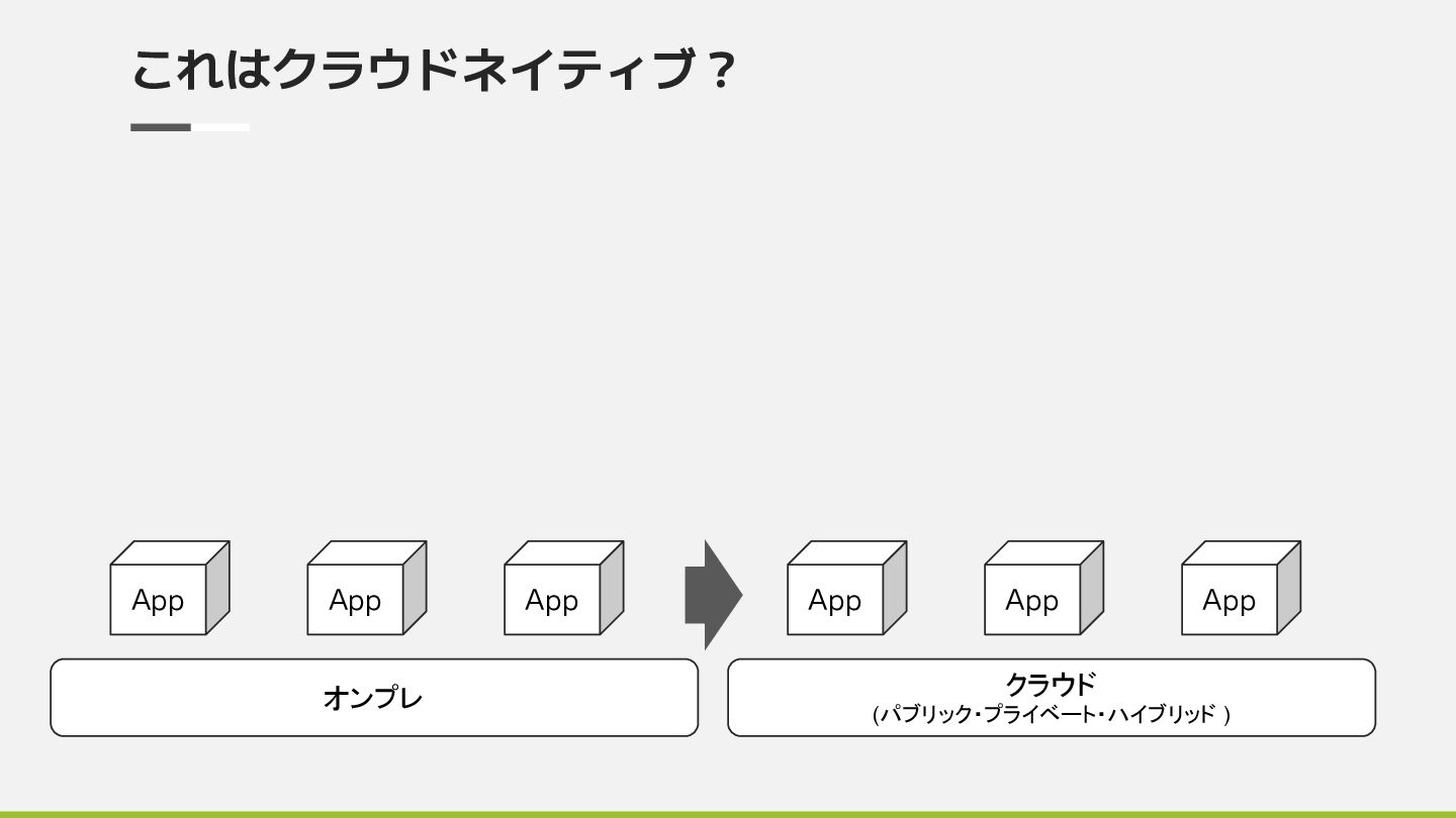 クラウド (パブリック・プライベート・ハイブリッド ) App App App これはクラウドネイティブ? オンプレ App App