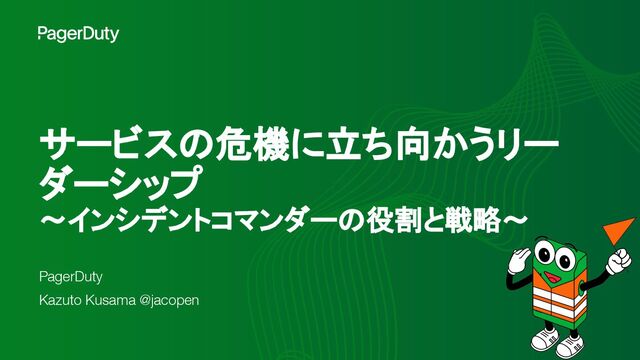 サービスの危機に立ち向かうリー ダーシップ ~インシデントコマンダーの役割と戦略~ PagerDuty Kazuto Kusama @jacopen