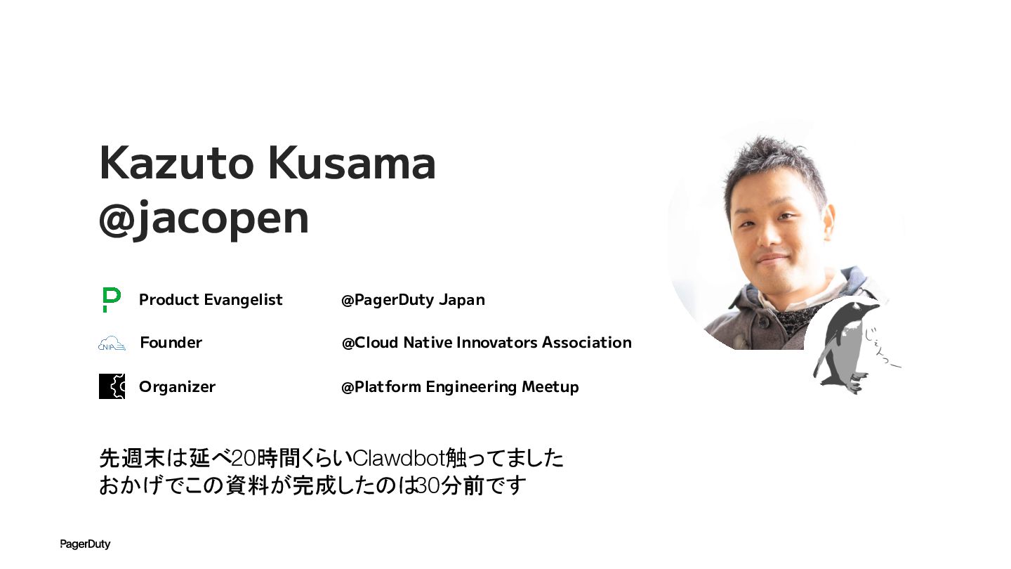 Kazuto Kusama @jacopen Product Evangelist @PagerDuty Japan Organizer @Platform Engineering