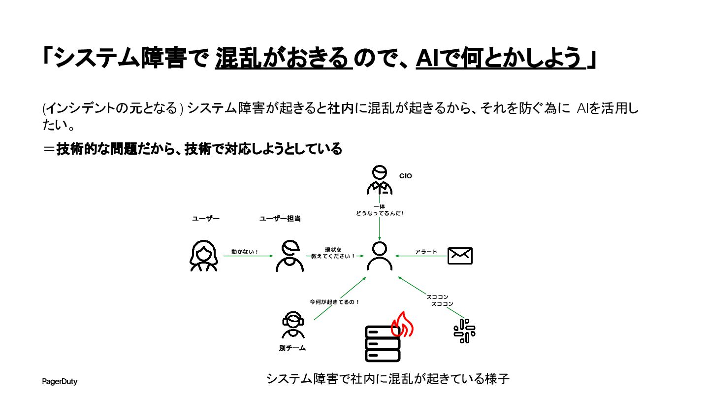 「システム障害で 混乱がおきる ので、AIで何とかしよう 」 (インシデントの元となる ) システム障害が起きると社内に混乱が起きるから、それを防ぐ為に AIを活用し たい =技術的な問題だから、技術で対応しようとしている