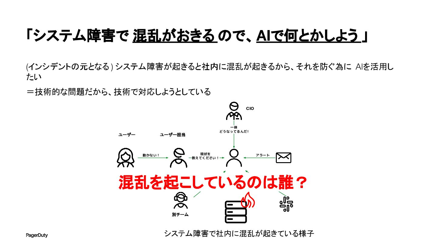 「システム障害で 混乱がおきる ので、AIで何とかしよう 」 (インシデントの元となる ) システム障害が起きると社内に混乱が起きるから、それを防ぐ為に AIを活用し たい。 =技術的な問題だから、技術で対応しようとしている