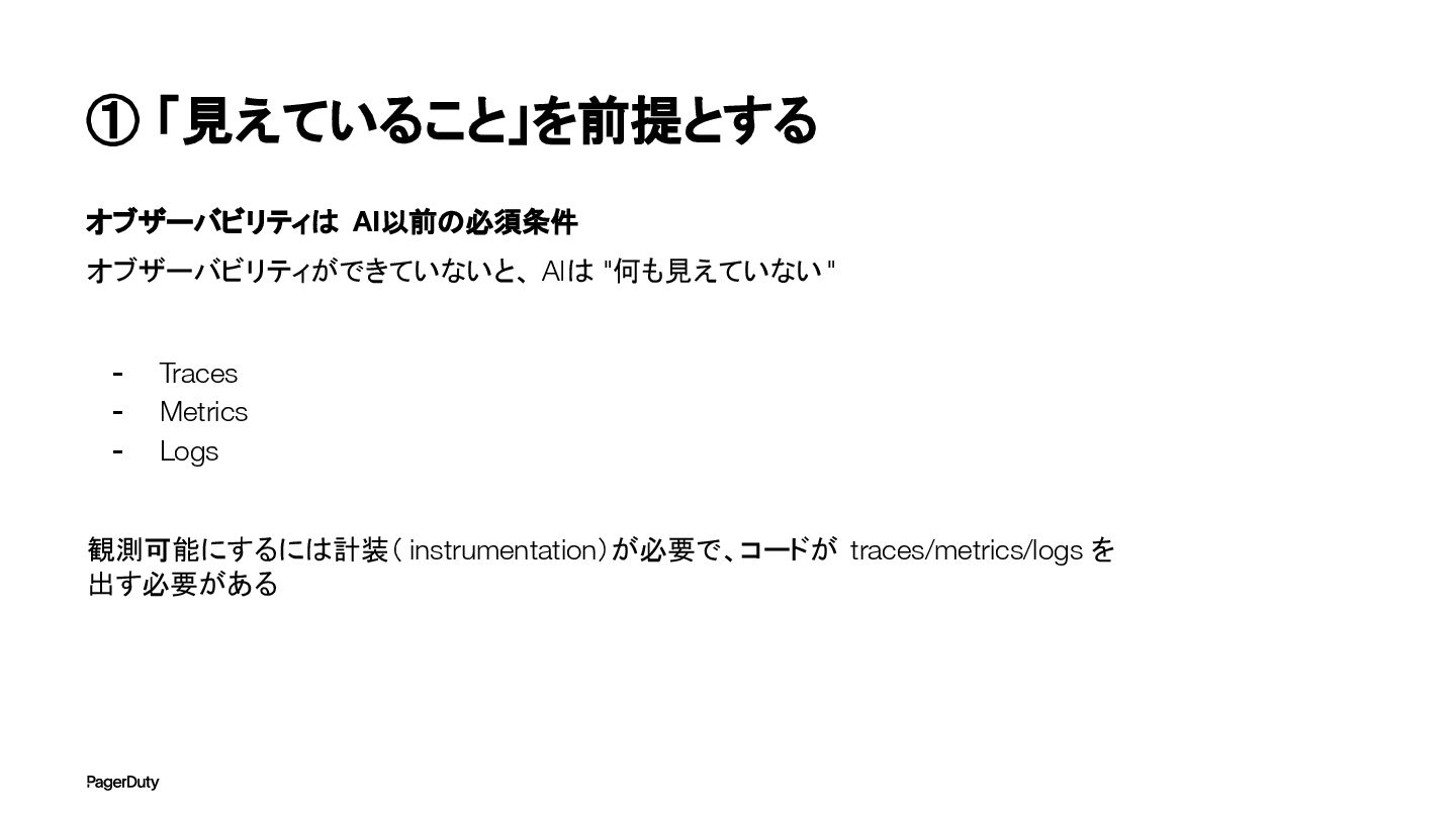 ① 「見えていること」を前提とする オブザーバビリティは AI以前の必須条件 オブザーバビリティができていないと、 AIは "何も見えていない" - Traces -