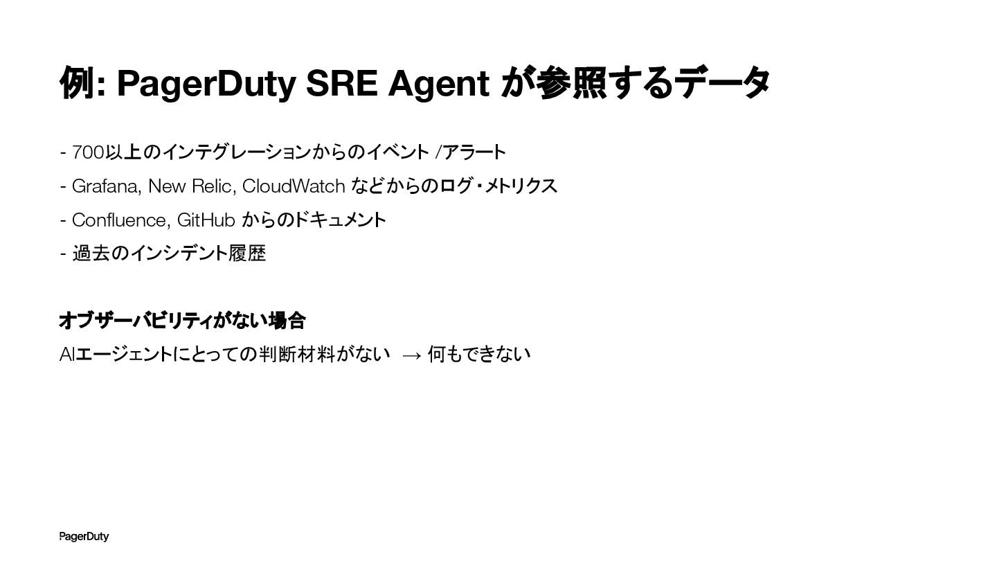 New Relic, CloudWatch などからのログ・メトリクス - Confluence, GitHub からのドキュメント - 過去のインシデント履歴 オブザーバビリティがない場合 AIエージェントにとっての判断材料がない → 何もできない