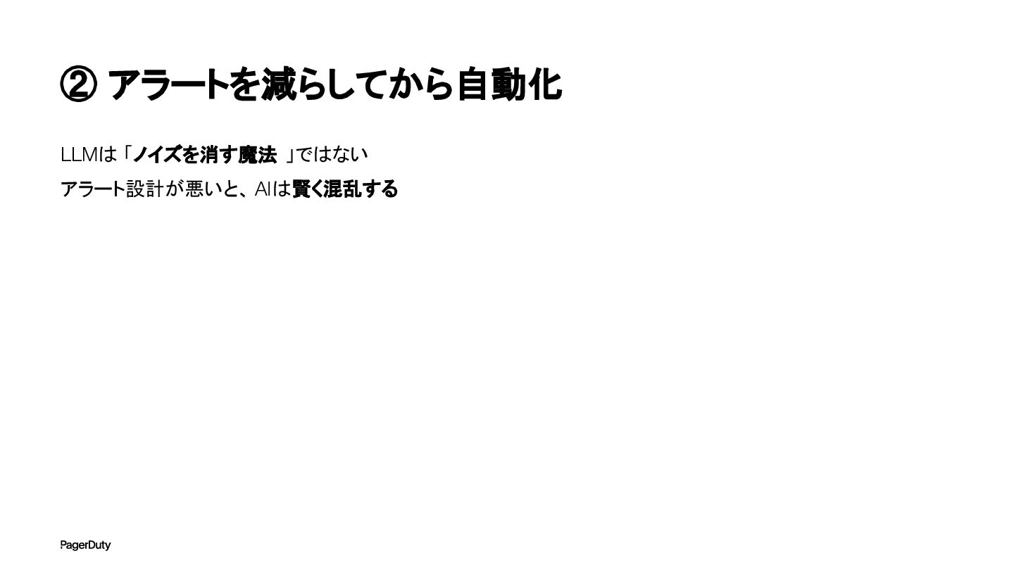 ② アラートを減らしてから自動化 LLMは 「ノイズを消す魔法 」ではない アラート設計が悪いと、 AIは賢く混乱する