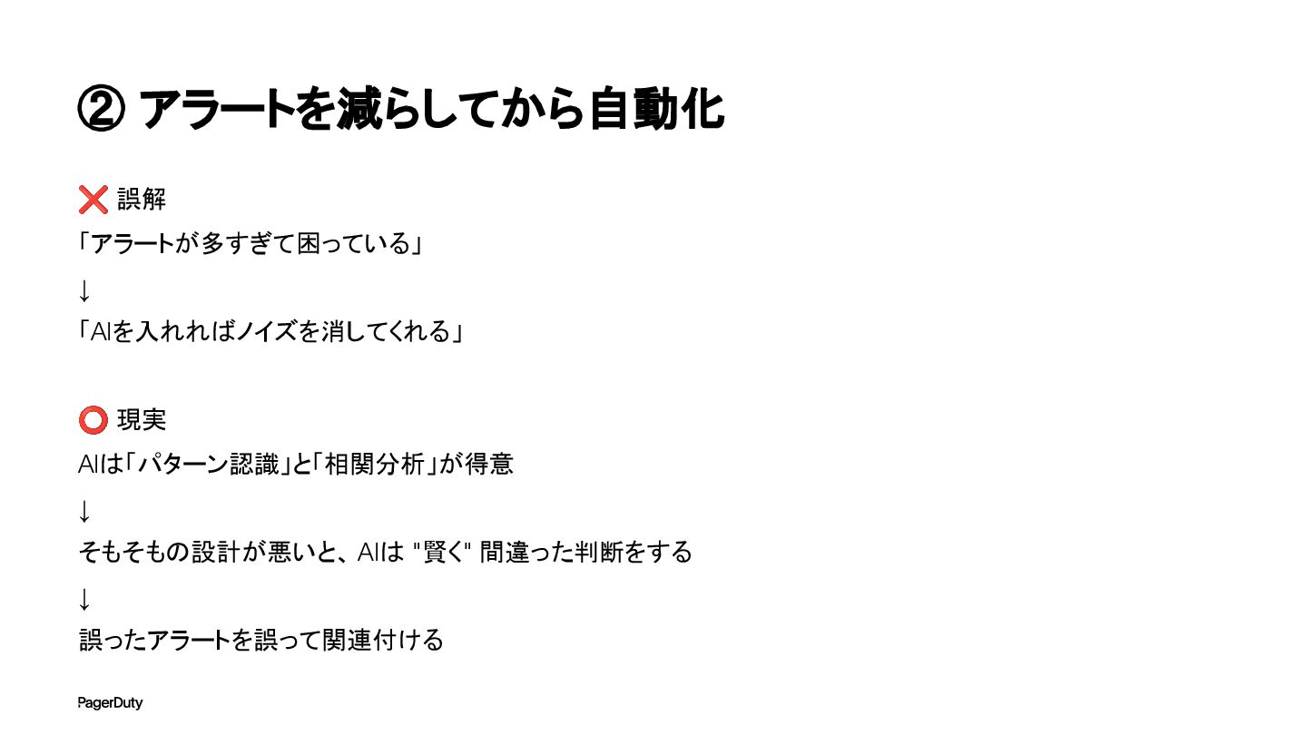 ② アラートを減らしてから自動化 ❌ 誤解 「アラートが多すぎて困っている」 ↓ 「AIを入れればノイズを消してくれる」 ⭕ 現実 AIは「パターン認識」と「相関分析」が得意