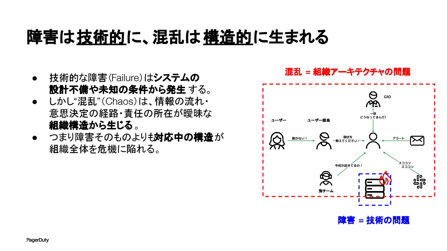 障害は技術的に、混乱は 構造的に生まれる • 技術的な障害(Failure)はシステムの 設計不備や未知の条件から発生 する。 • しかし“混乱”(Chaos)は、情報の流れ・ 意思決定の経路・責任の所在が曖昧な 組織構造から生じる。