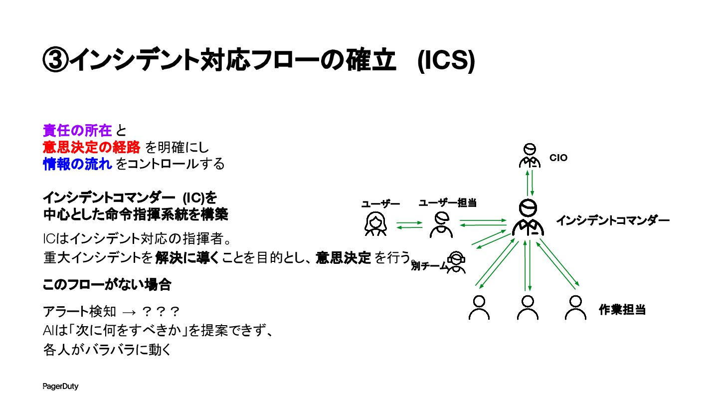 ③インシデント対応フローの確立 (ICS) 責任の所在 と 意思決定の経路 を明確にし 情報の流れ をコントロールする インシデントコマンダー (IC)を