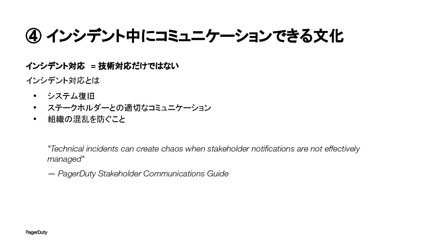 ④ インシデント中にコミュニケーションできる文化 インシデント対応 = 技術対応だけではない インシデント対応とは • システム復旧 • ステークホルダーとの適切なコミュニケーション