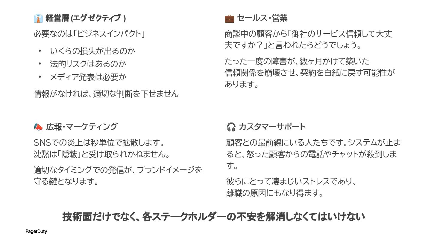 情報がなければ、適切な判断を下せません 📣 広報・マーケティング SNSでの炎上は秒単位で拡散します。 沈黙は「隠蔽」と受け取られかねません。 適切なタイミングでの発信が、ブランドイメージを 守る鍵となります。 🎧 カスタマーサポート 顧客との最前線にいる人たちです。システムが止ま ると、怒った顧客からの電話やチャットが殺到しま す。 彼らにとって凄まじいストレスであり、 離職の原因にもなり得ます。 技術面だけでなく、各ステークホルダーの不安を解消しなくてはいけない 💼 セールス・営業 商談中の顧客から「御社のサービス信頼して大丈 夫ですか?」と言われたらどうでしょう。 たった一度の障害が、数ヶ月かけて築いた 信頼関係を崩壊させ、契約を白紙に戻す可能性が あります。