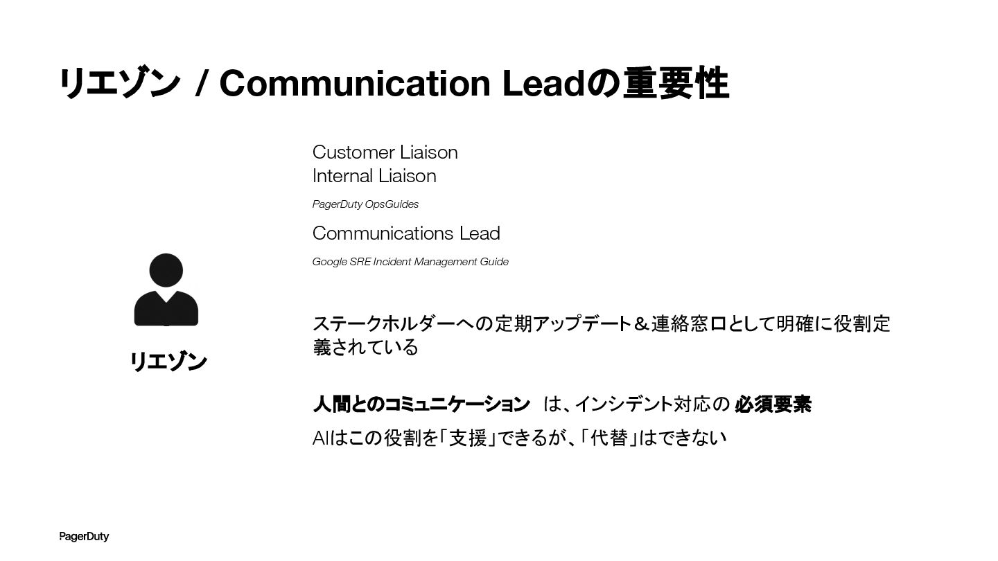OpsGuides Communications Lead Google SRE Incident Management Guide ステークホルダーへの定期アップデート&連絡窓口として明確に役割定 義されている 人間とのコミュニケーション は、インシデント対応の 必須要素 AIはこの役割を「支援」できるが、「代替」はできない