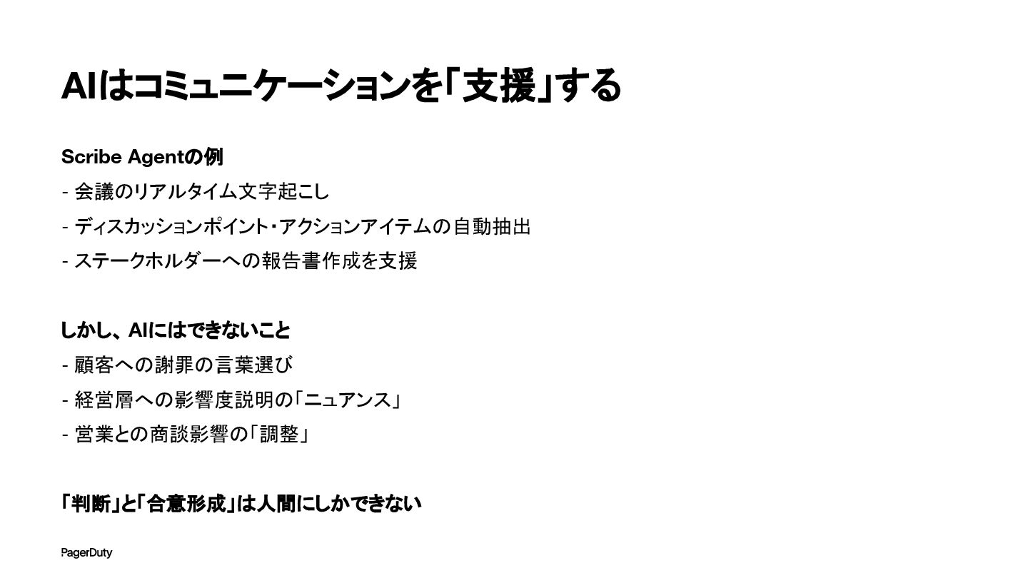 AIはコミュニケーションを「支援」する Scribe Agentの例 - 会議のリアルタイム文字起こし - ディスカッションポイント・アクションアイテムの自動抽出 - ステークホルダーへの報告書作成を支援 しかし、