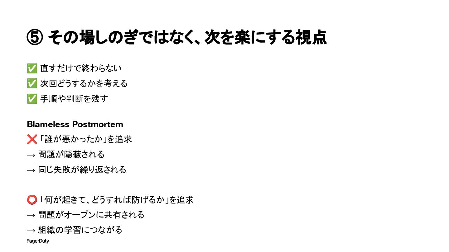 ⑤ その場しのぎではなく、次を楽にする視点 ✅ 直すだけで終わらない ✅ 次回どうするかを考える ✅ 手順や判断を残す Blameless Postmortem