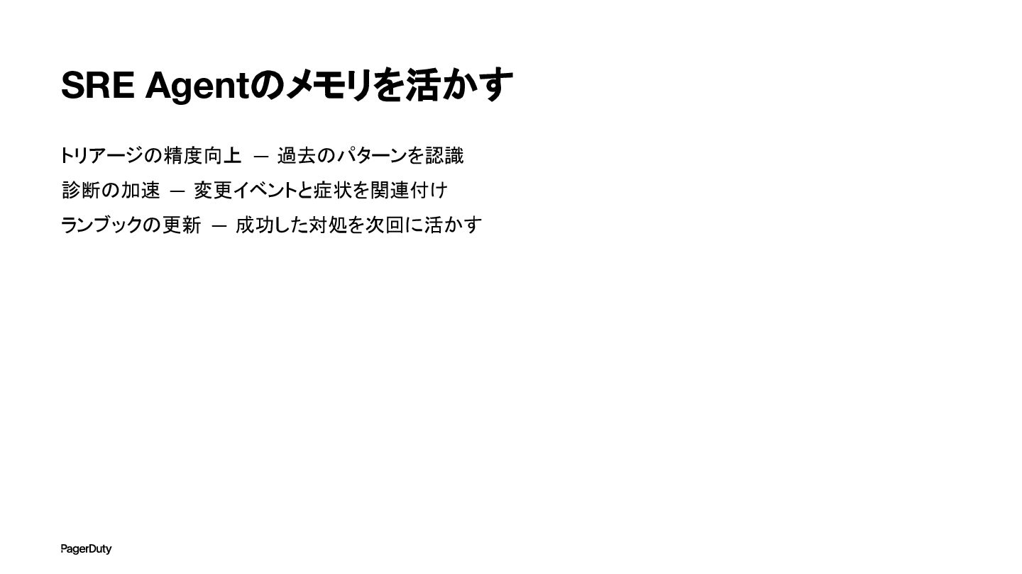 SRE Agentのメモリを活かす トリアージの精度向上 — 過去のパターンを認識 診断の加速 — 変更イベントと症状を関連付け ランブックの更新 —