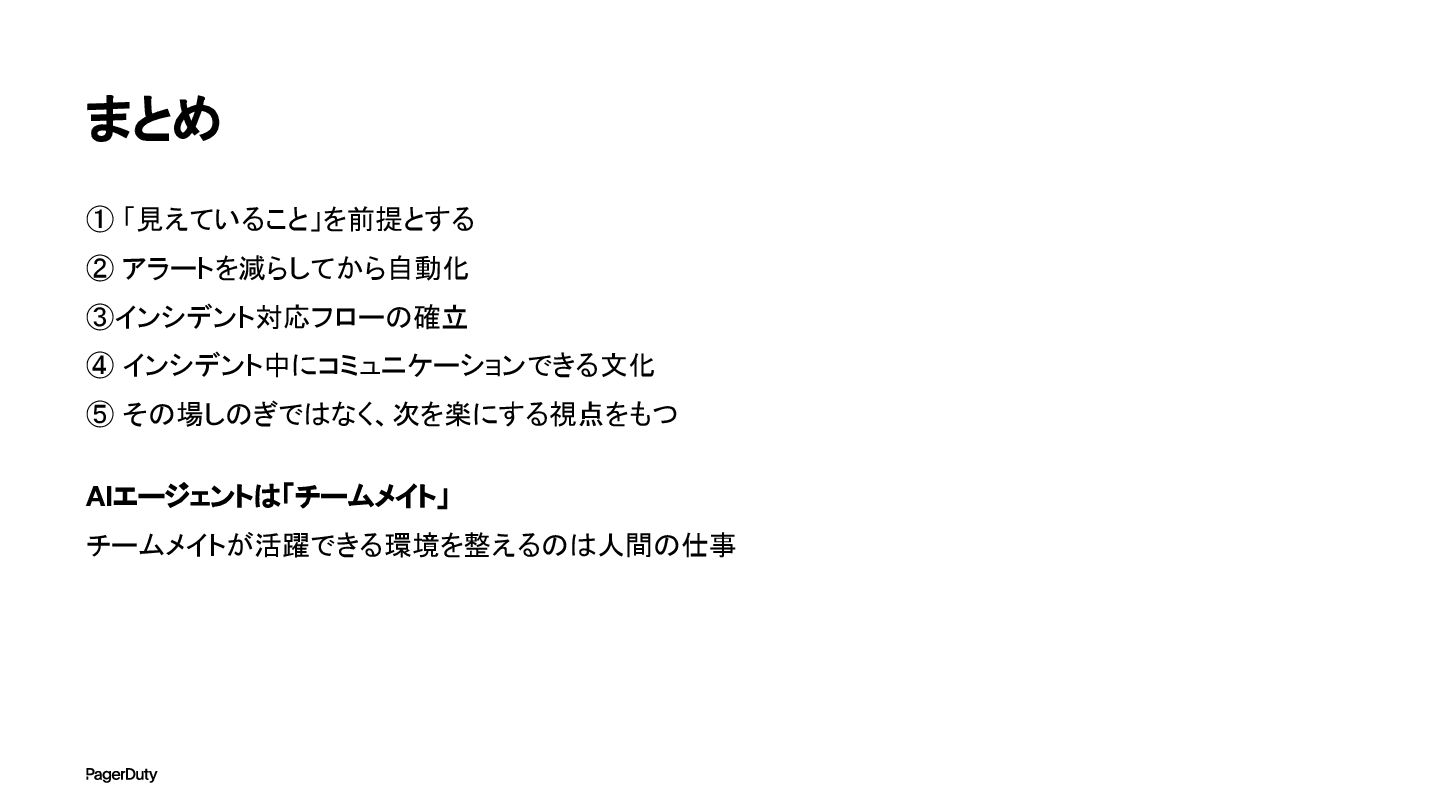 まとめ ① 「見えていること」を前提とする ② アラートを減らしてから自動化 ③インシデント対応フローの確立 ④ インシデント中にコミュニケーションできる文化 ⑤ その場しのぎではなく、次を楽にする視点をもつ