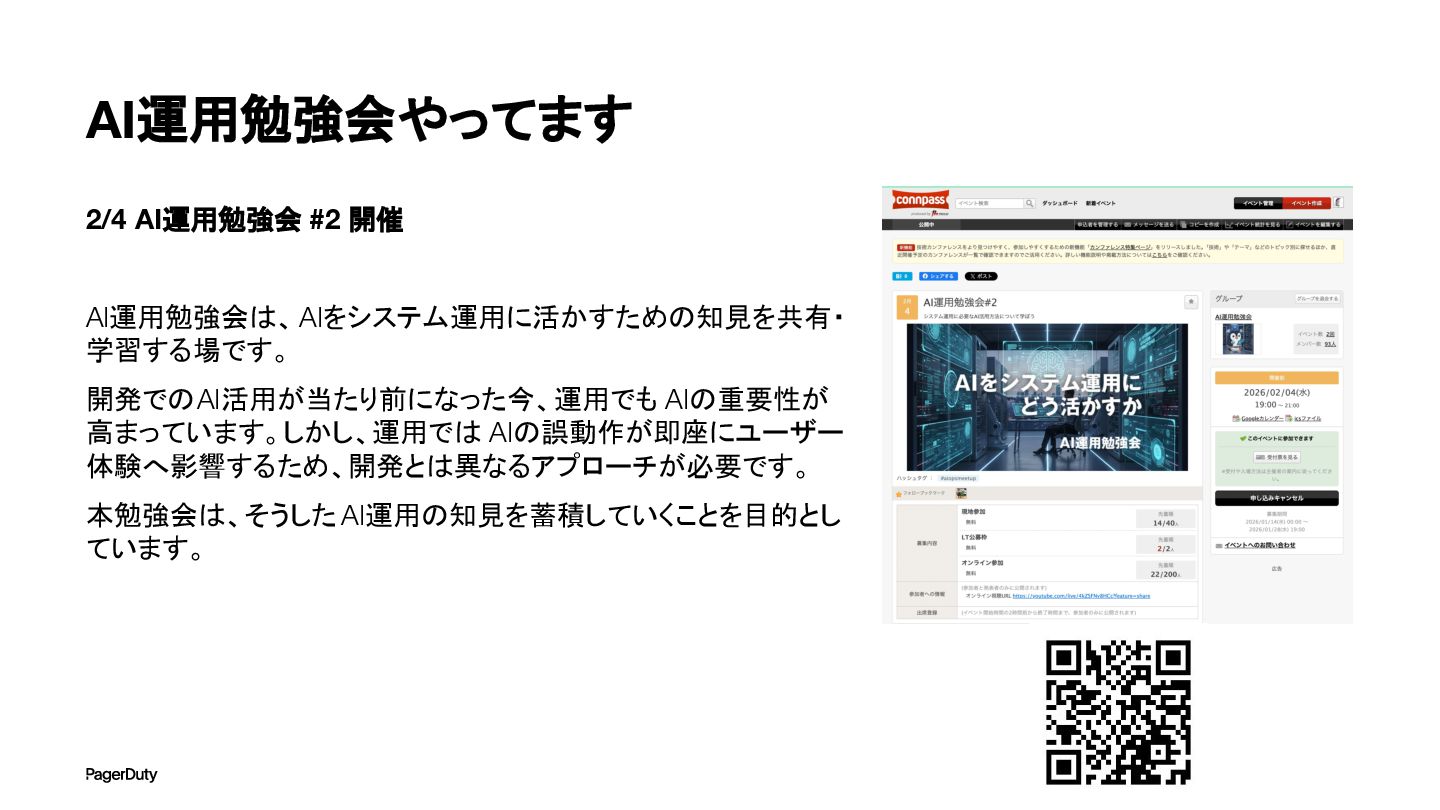 AIの誤動作が即座にユーザー 体験へ影響するため、開発とは異なるアプローチが必要です。 本勉強会は、そうした AI運用の知見を蓄積していくことを目的とし ています。