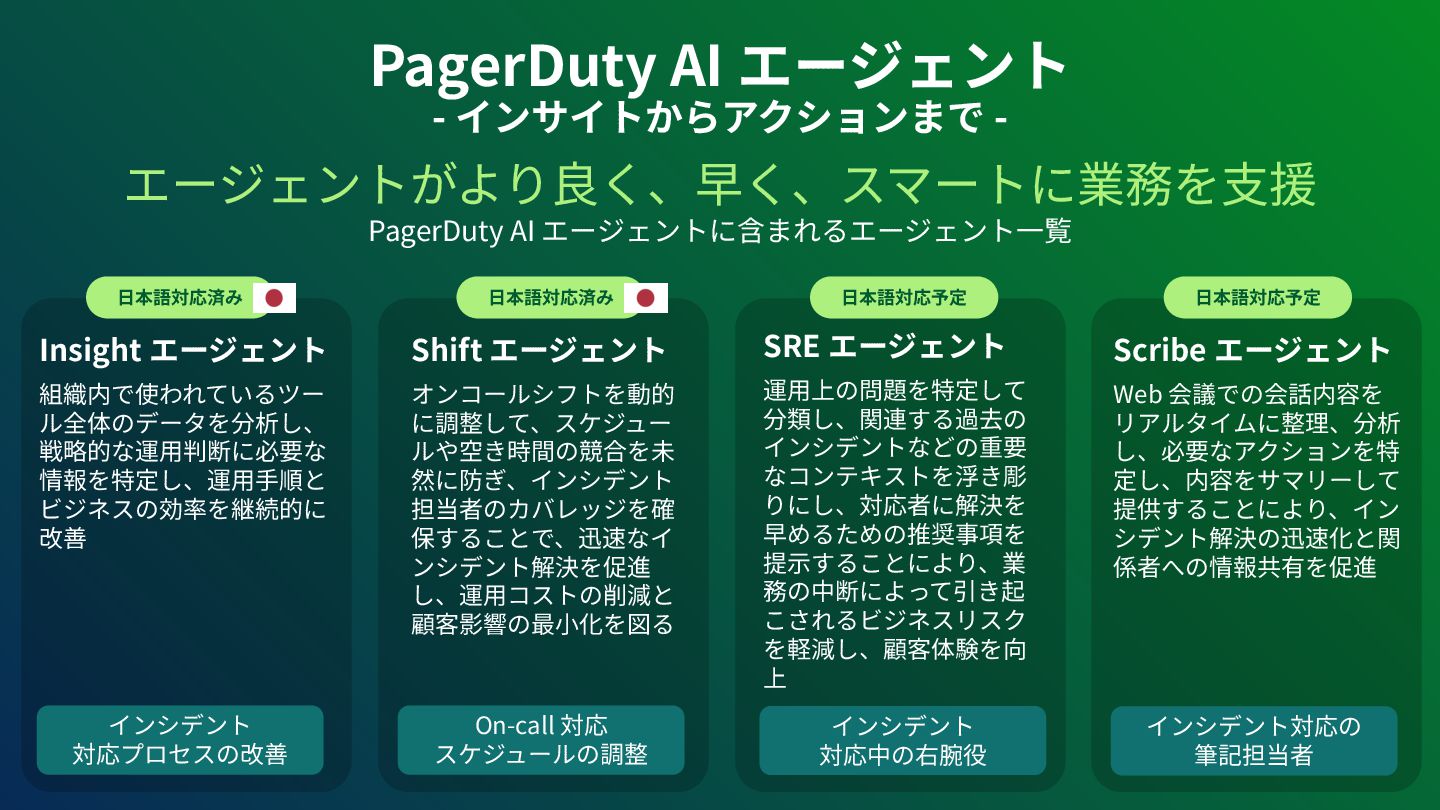 SRE エージェント 運⽤上の問題を特定して 分類し、関連する過去の インシデントなどの重要 なコンテキストを浮き彫 りにし、対応者に解決を 早めるための推奨事項を 提⽰することにより、業 務の中断によって引き起 こされるビジネスリスク を軽減し、顧客体験を向 上 Insight エージェント 組織内で使われているツー ル全体のデータを分析し、 戦略的な運⽤判断に必要な 情報を特定し、運⽤⼿順と ビジネスの効率を継続的に 改善 Shift エージェント オンコールシフトを動的 に調整して、スケジュー ルや空き時間の競合を未 然に防ぎ、インシデント 担当者のカバレッジを確 保することで、迅速なイ ンシデント解決を促進 し、運⽤コストの削減と 顧客影響の最⼩化を図る Scribe エージェント Web 会議での会話内容を リアルタイムに整理、分析 し、必要なアクションを特 定し、内容をサマリーして 提供することにより、イン シデント解決の迅速化と関 係者への情報共有を促進 インシデント 対応プロセスの改善 On-call 対応 スケジュールの調整 インシデント 対応中の右腕役 インシデント対応の 筆記担当者 ⽇本語対応済み ⽇本語対応予定 ⽇本語対応予定 ⽇本語対応済み