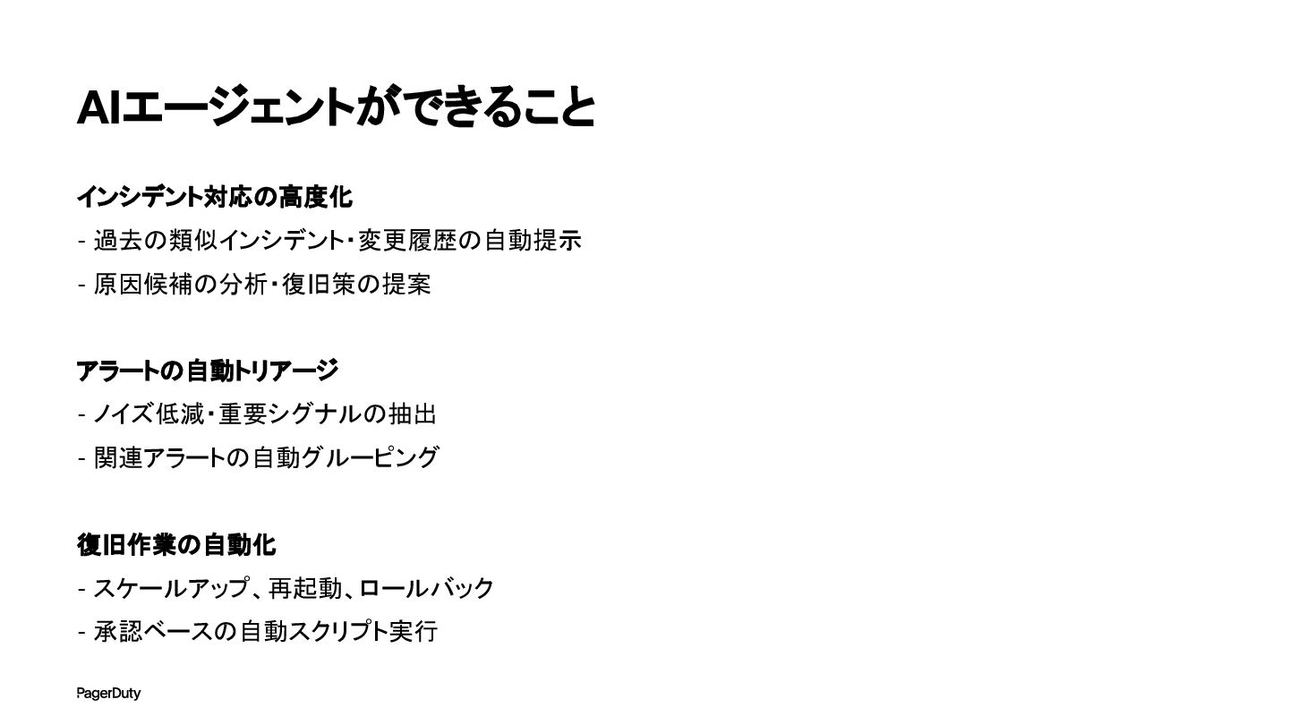 AIエージェントができること インシデント対応の高度化 - 過去の類似インシデント・変更履歴の自動提示 - 原因候補の分析・復旧策の提案 アラートの自動トリアージ - ノイズ低減・重要シグナルの抽出 -