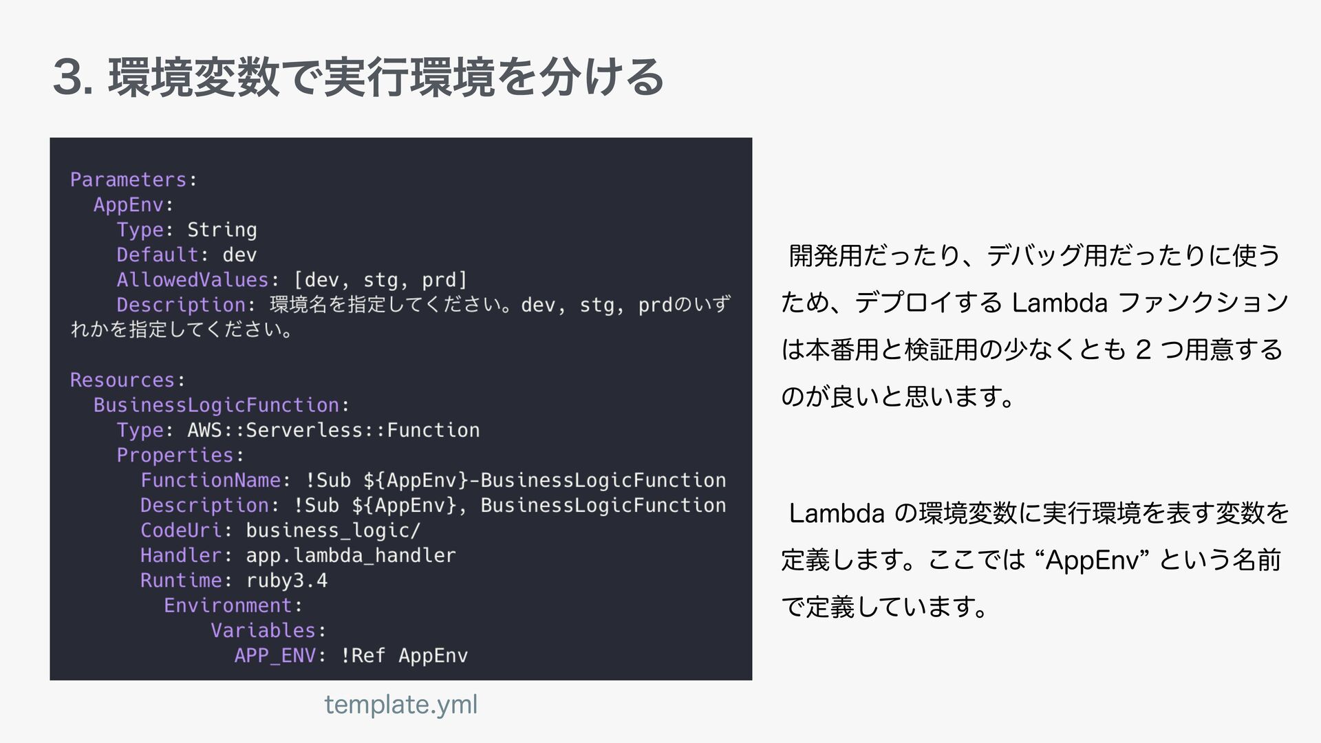 ڥมͰ࣮ߦڥΛ͚Δ UFNQMBUFZNM ։ൃ༻ͩͬͨΓɺσόοά༻ͩͬͨΓʹ͏ ͨΊɺσϓϩΠ͢Δ-BNCEBϑΝϯΫγϣϯ ຊ൪༻ͱݕূ༻ͷগͳ͘ͱͭ༻ҙ͢Δ ͷ͕ྑ͍ͱࢥ͍·͢ɻ -BNCEBͷڥมʹ࣮ߦڥΛද͢มΛ ఆٛ͠·͢ɻ͜͜Ͱl"QQ&OWzͱ͍͏໊લ Ͱఆ͍ٛͯ͠·͢ɻ