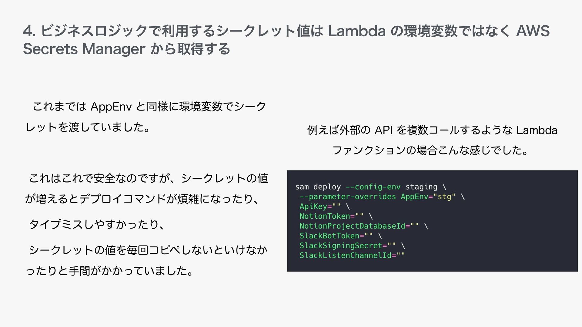 ϏδωεϩδοΫͰར༻͢ΔγʔΫϨοτ-BNCEBͷڥมͰͳ͘"84 4FDSFUT.BOBHFS͔Βऔಘ͢Δ ྫ͑֎෦ͷ"1*Λෳίʔϧ͢ΔΑ͏ͳ-BNCEB ϑΝϯΫγϣϯͷ߹͜Μͳײ͡Ͱͨ͠ɻ ͜Ε·Ͱ"QQ&OWͱಉ༷ʹڥมͰγʔΫ ϨοτΛ͍ͯ͠·ͨ͠ɻ ͜Ε͜ΕͰ҆શͳͷͰ͕͢ɺγʔΫϨοτͷ ͕૿͑ΔͱσϓϩΠίϚϯυ͕ࡶʹͳͬͨΓɺ λΠϓϛε͔ͬͨ͢͠Γɺ γʔΫϨοτͷΛຖճίϐϖ͠ͳ͍ͱ͍͚ͳ͔