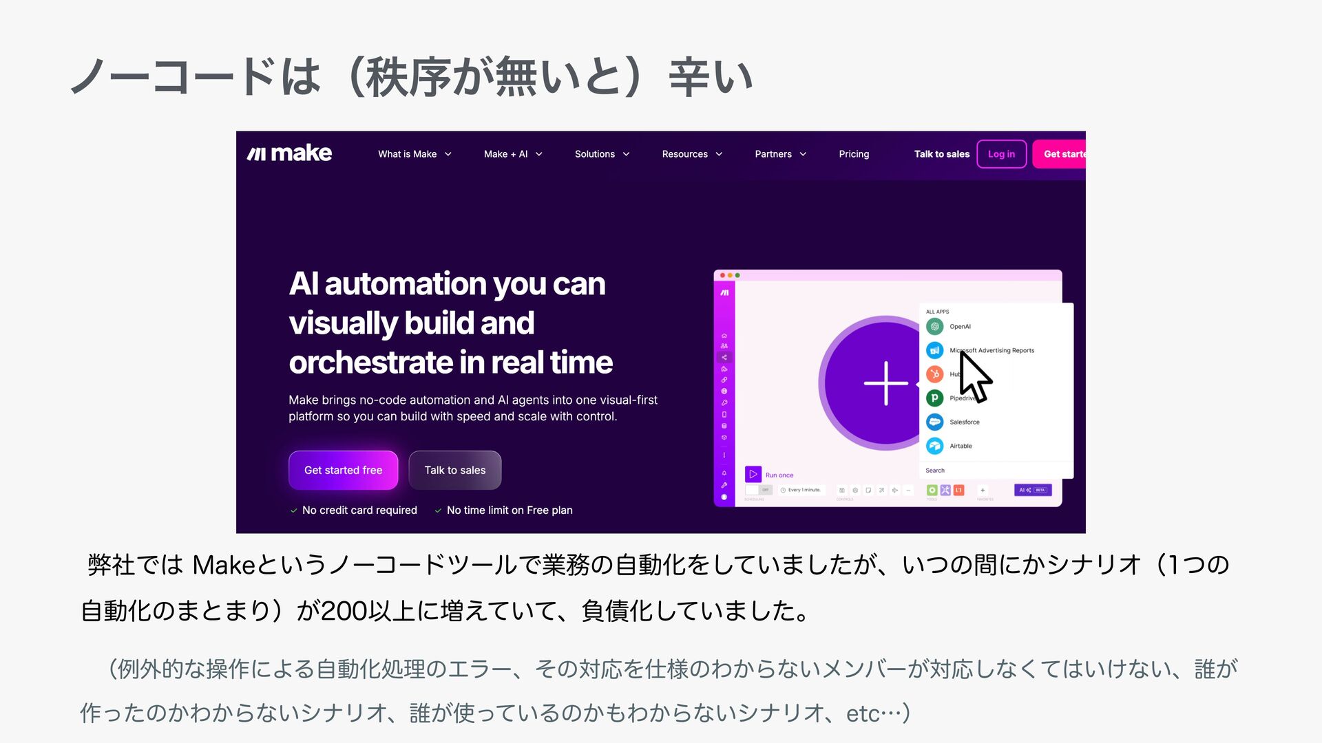 ฐࣾͰ.BLFͱ͍͏ϊʔίʔυπʔϧͰۀͷࣗಈԽΛ͍ͯ͠·͕ͨ͠ɺ͍ͭͷؒʹ͔γφϦΦʢͭͷ ࣗಈԽͷ·ͱ·Γʣ͕Ҏ্ʹ૿͍͑ͯͯɺෛ࠴Խ͍ͯ͠·ͨ͠ɻ ʢྫ֎తͳૢ࡞ʹΑΔࣗಈԽॲཧͷΤϥʔɺͦͷରԠΛ༷ͷΘ͔Βͳ͍ϝϯόʔ͕ରԠ͠ͳ͍͚ͯ͘ͳ͍ɺ୭͕ ࡞ͬͨͷ͔Θ͔Βͳ͍γφϦΦɺ୭͕͍ͬͯΔͷ͔Θ͔Βͳ͍γφϦΦɺFUDʜʣ ϊʔίʔυʢடং͕ແ͍ͱʣਏ͍