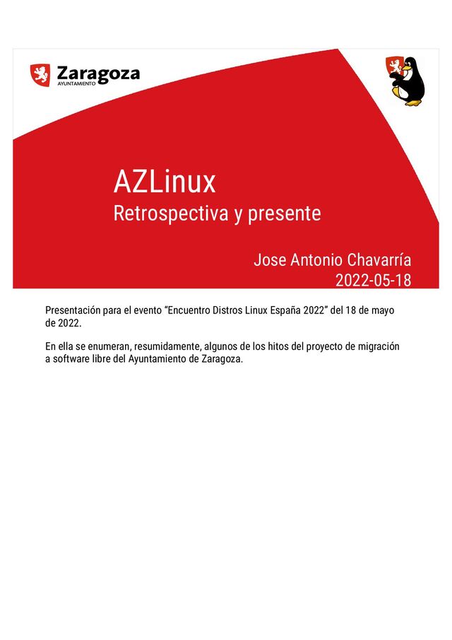 el evento “Encuentro Distros Linux España 2022” del 18 de mayo de 2022. En ella se enumeran, resumidamente, algunos de los hitos del proyecto de migración a software libre del Ayuntamiento de Zaragoza.